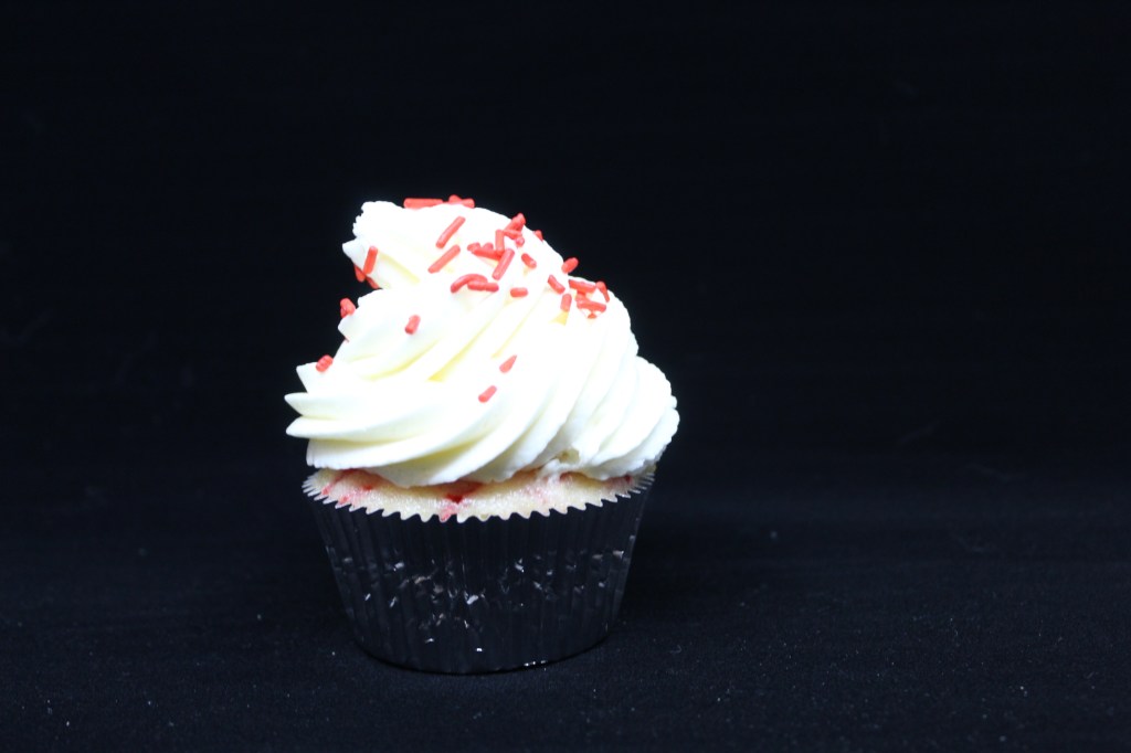 How do you make cupcakes even more fun? Sprinkles baked in the batter and more on top of the frosting, that’s how! Here is a vanilla cupcake with a vanilla buttercream frosting. The frosting has a hint of almond flavor to it for sophistication, but it doesn’t take away from the fun.