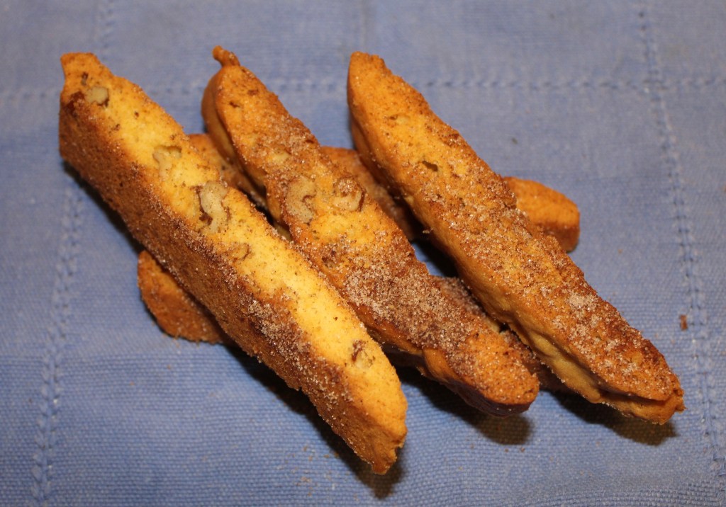 I grew up calling this crispy treat as Mandel Brot. It’s the Yiddish word for almond bread. To those who grew up with Biscotti, you will find it very similar. I am not a fan of almonds, so I placed walnuts in the recipe instead. They are baked twice yielding a crunchy cookie that goes perfectly with your tea or coffee. After it is baked it is dusted with cinnamon sugar, making them irresistible!