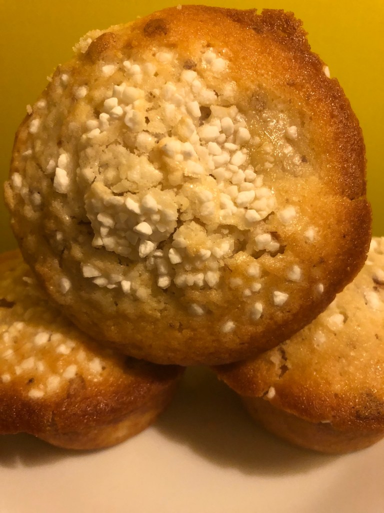I’ve been working on new additions to my menu. Lately I have been obsessed with creating the perfect, moist muffins. These are filled with pears, candied ginger, and have roasted walnuts that you crunch into every bite. By using oil and heavy cream in the batter, this adds wonderful flavor and a moist soft texture. The pearlized sugar topping is imported from Sweden. Baking at a high oven temperature is what gives these muffins their high peaks.